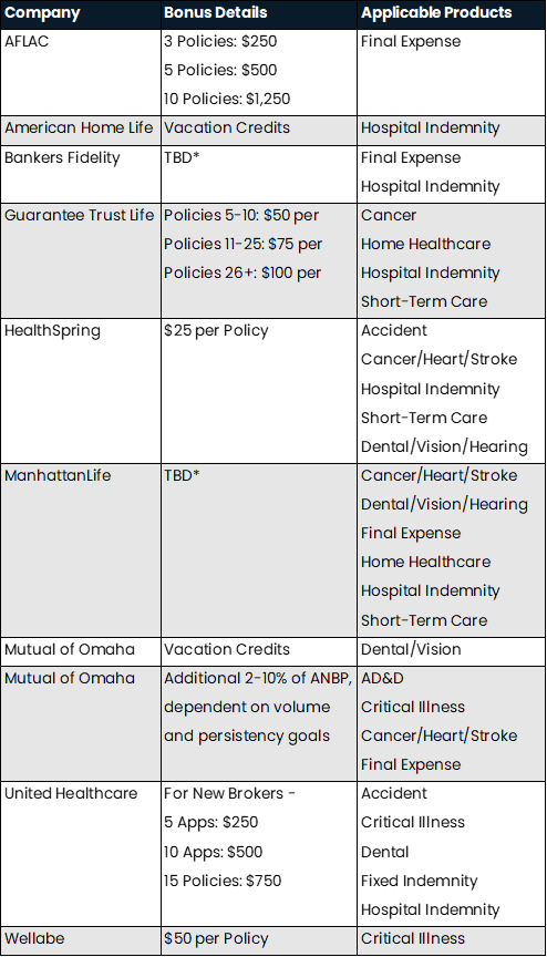 Insurance companies that operate in the brokerage ancillary market typically offer per policy bonuses to encourage agents to sell their products. These bonuses go beyond traditional commission schedules and often apply to a carrier’s suite of ancillary product offerings.