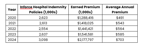 As previously shared, it’s also a growing line of business. Earned premium for individual hospital indemnity business topped $2 billion for the first time in 2024 (nearly $2.2 billion to be exact!). Earned premium growth has averaged 14% per year since 2020, and annual inforce count growth averaged 4% per year over that same timeframe. An especially exciting development in 2024 for carriers participating in this market: not only did the volume of business increase significantly, but the average per-policy premium also increased at the same time, topping $700 for the first time!