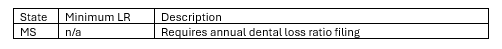 Now that we’re one quarter into 2026, another round of bills that could impact dental insurance are underway! So far in 2026 we are tracking 16 bills related to dental insurance, plus a bulletin on implementing the ND bill noted above. All 16 of these bills introduce an annual dental loss ratio filing requirement, and most of the 16 also require a minimum loss ratio in the range of 75% - 85%. One Mississippi bill has been approved at this point – see the table below. The other states where these bills are being considered in 2026 (so far): AK, AL, HI, ID, MN, MO, NE, NY, WA, WV.