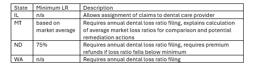 Proposed regulatory activity related to dental insurance has been increasing, essentially since Massachusetts added a dental loss ratio requirement effective in 2024. Several other states have dental loss ratio reporting requirements in place now, and it appears that additional states may be adding similar requirements in the near future.